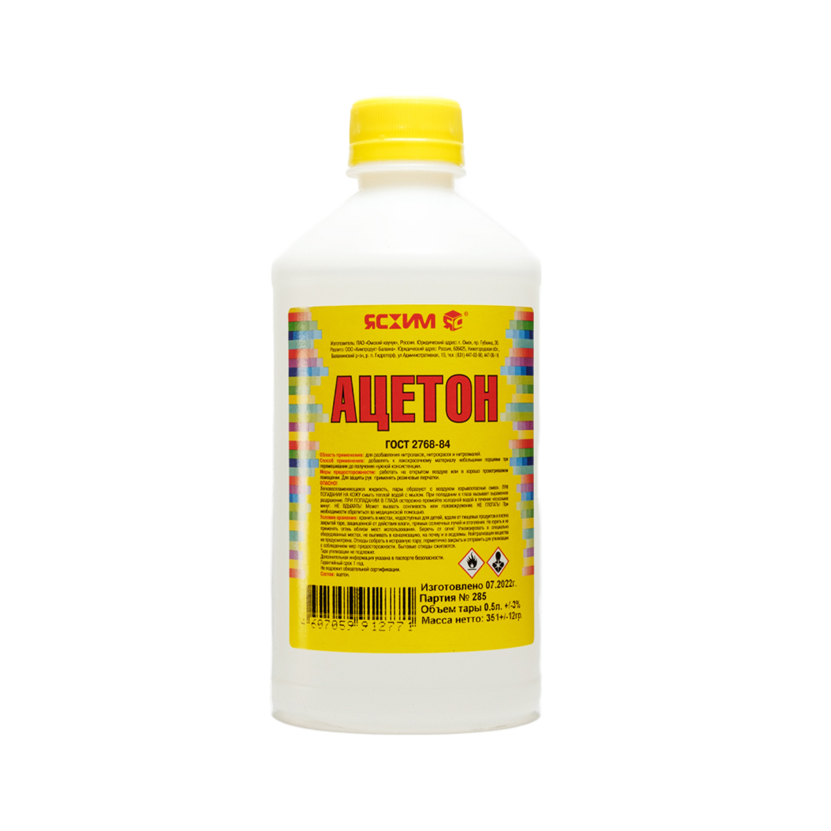 Ацетон технический 0,5 л. Используется для синтеза уксусного ангидрида, ацетонциангидрина, дифенилолпропана и других органических продуктов, а также в качестве растворителя в различных отраслях промышленности, для разбавления нитроцелюлозных, на основе эпоксидных и виниловыхполимеров. Для обезжиривания и очистки поверхностей. Ацетон упакован в бутылку из полиэтилентерефталата.