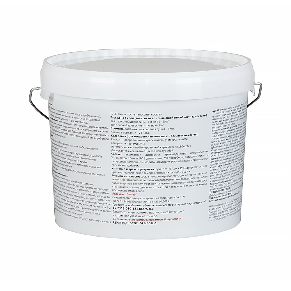 Состав: акрилатная дисперсия, транспарентные нано-пигменты, УФ-фильтры UV-A и UV-B диапазонов, УФ-абсорберы, трудновымываемые антисептические и биоцидные компоненты, модифицирующие, регулирующие и другие технологические добавки.