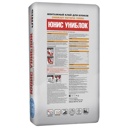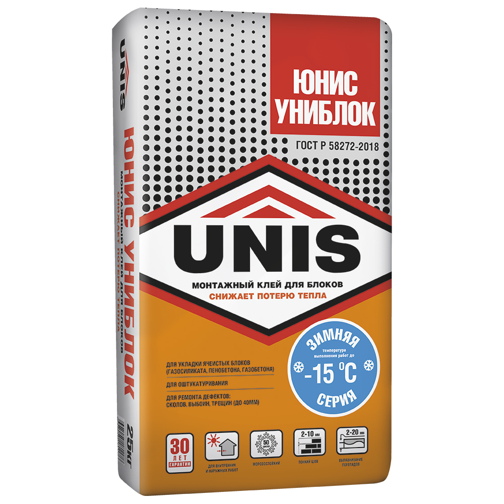 Кладочно-монтажный клей "УНИБЛОК ЗИМНИЙ" для наружных и внутренних работ предназначен для кладки стен и перегородок из блоков и плит на основе ячеистых бетонов (пенобетона и газобетона), газосиликата, силикатных блоков и плит.