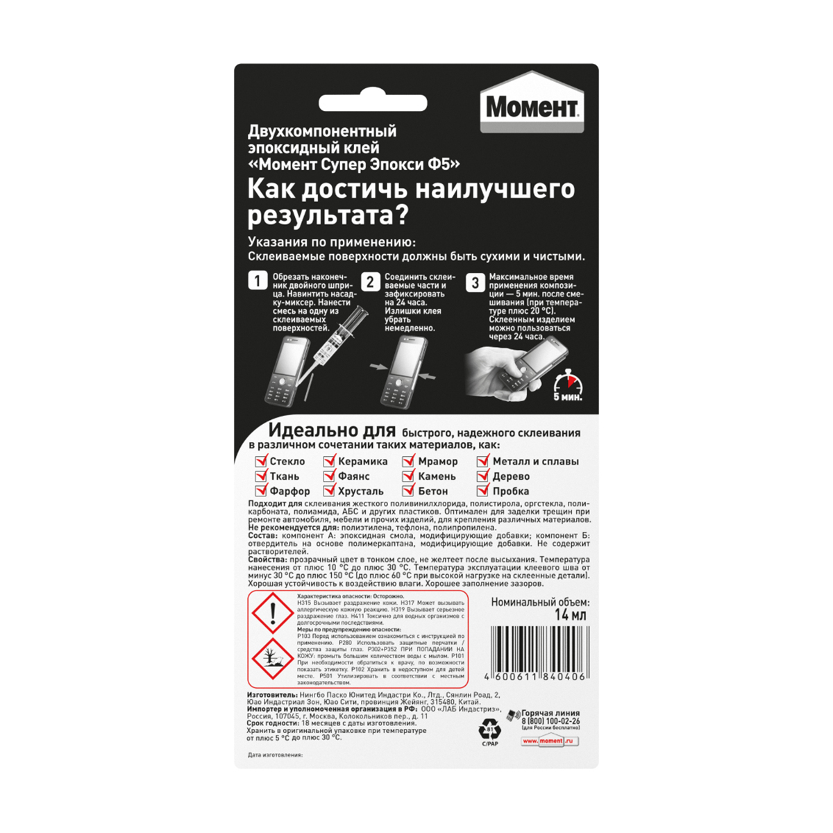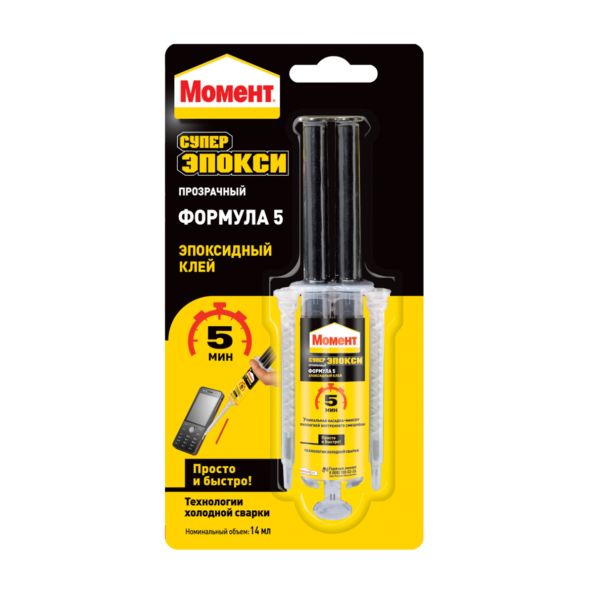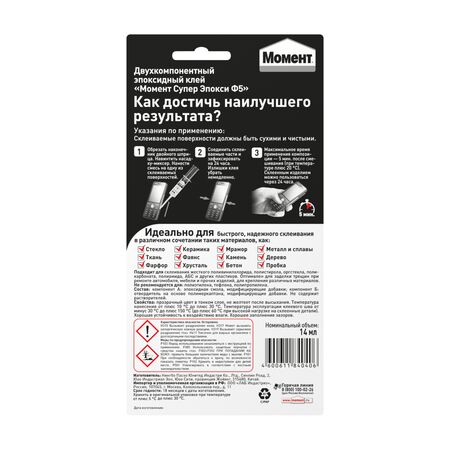Универсальный эпоксидный клей Момент Супер Эпокси Формула 5 в шприце обеспечит вас комфортным, прочным и быстрым склеиванием при работе практически с любыми материалами.