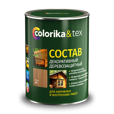 Состав деревозащитный декоративный «Colorika&Tex» - это современное высокоэффективное средство на алкидной основе для защитно-декоративной обработки пиленых и строганых деревянных поверхностей внутри и снаружи помещений. Состав «Colorika&Tex» специально разработан с учетом российских климатических условий. В состав рецептуры входят натуральные масла и воски, нанопигменты, УФ - фильтры, антисептические и биоцидные добавки, что позволяет добиться повышенной устойчивости покрытия к воздействию атмосферных осадков, ультрафиолетовых лучей, отталкивать воду, долго сохранять цветовой оттенок и сохранять текстуру древесины.